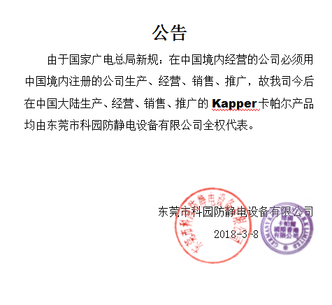由于國家廣電總局新規(guī):在中國境內(nèi)經(jīng)營的公司必須用中國境內(nèi)注冊的公司生產(chǎn)、經(jīng)營、銷售、推廣,故我司今后在中國大陸生產(chǎn)、經(jīng)營、銷售、推廣的Kapper卡帕爾產(chǎn)品均由東莞市科園防靜電設備有限公司全權(quán)代表