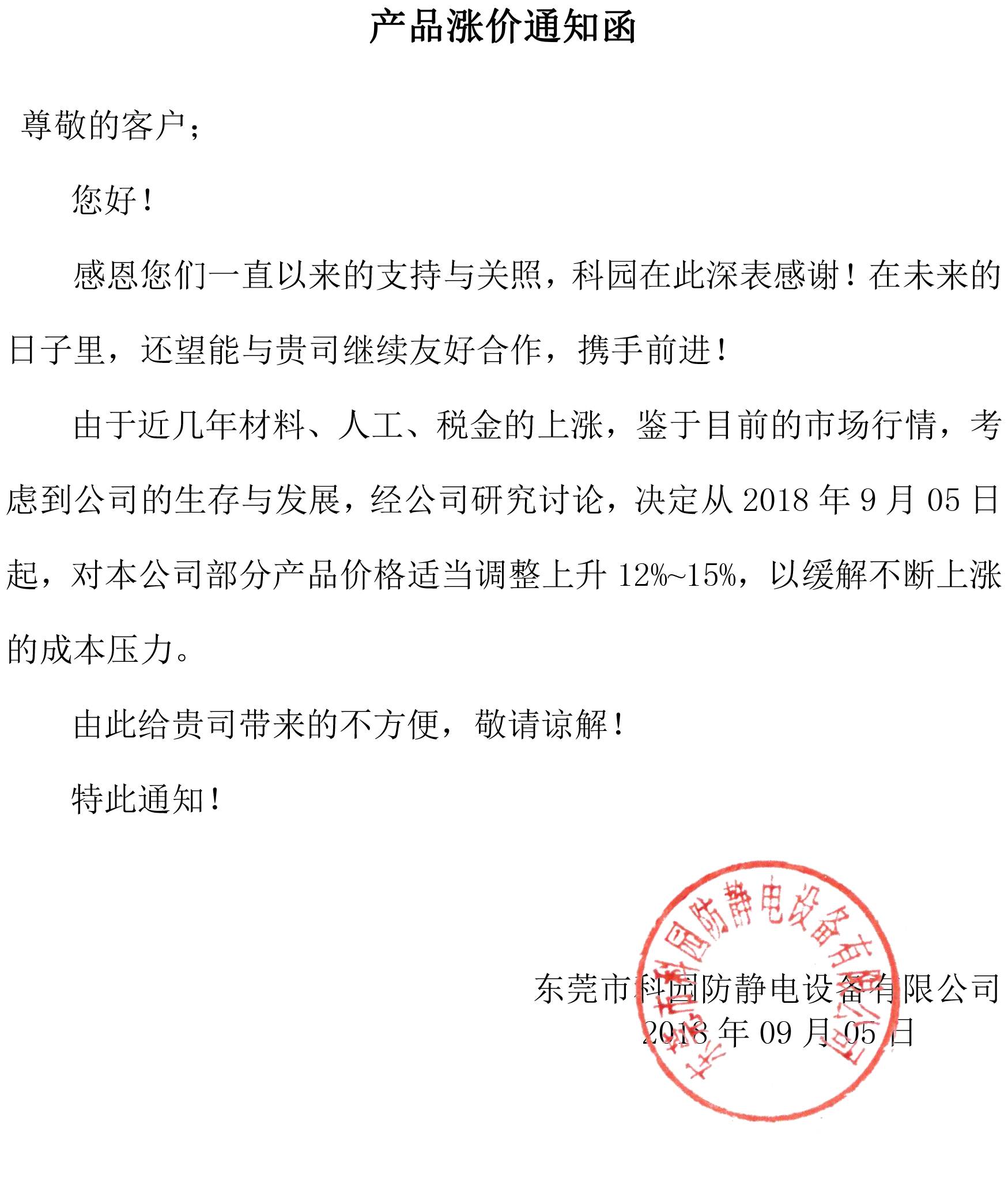 由于近幾年材料、人工、稅金的上漲,鑒于目前的市場行情,考慮到公司的生存與發(fā)展,經(jīng)公司研究討論,決定從2018年9月05日起,對本公司部分產(chǎn)品價格適當(dāng)調(diào)整上升12%~15%...