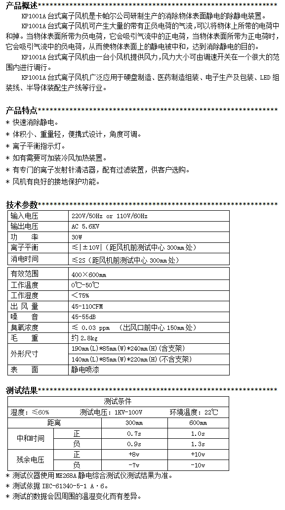 KP1001A第三代臺式離子風(fēng)機(jī)